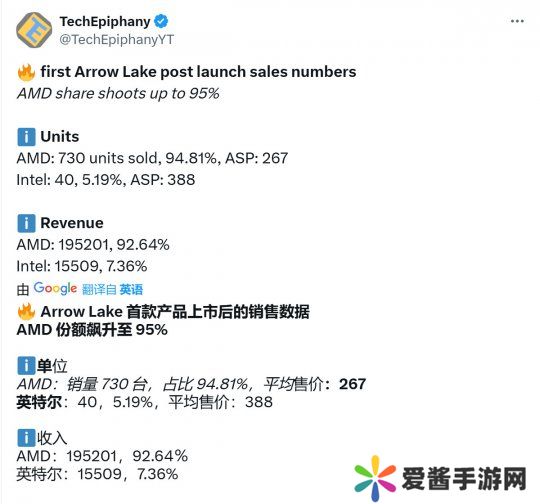 据德国零售商Mindfactory发布的销量数据,AMD统治了CPU市场,AMD占据了94.81%的市场份额,而Intel只有5.19%。
