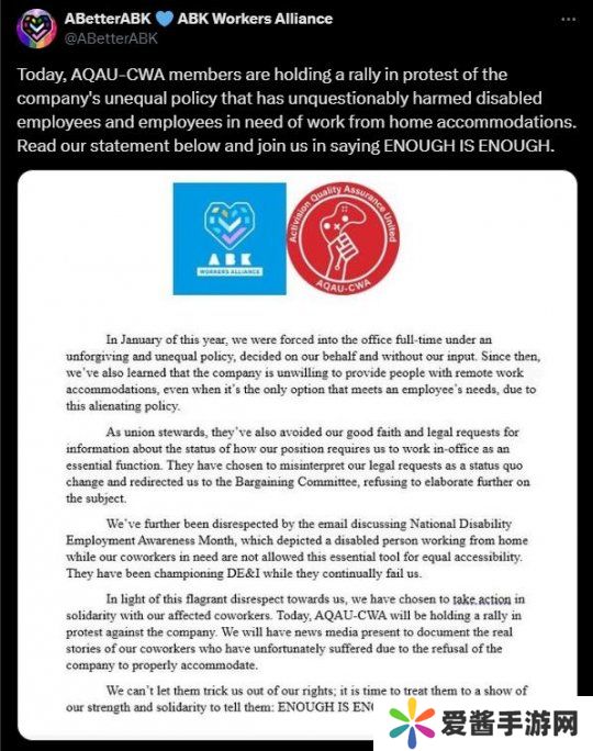 在抗议活动发生之前,动视工人组织ABetterABK发表声明称,这项“不平等政策”无疑损害了“残疾员工和需要在家办公的员工”的利益,并声称自该政策推出以来的几个月里,这些人被不公平地要求返回办公室工作。