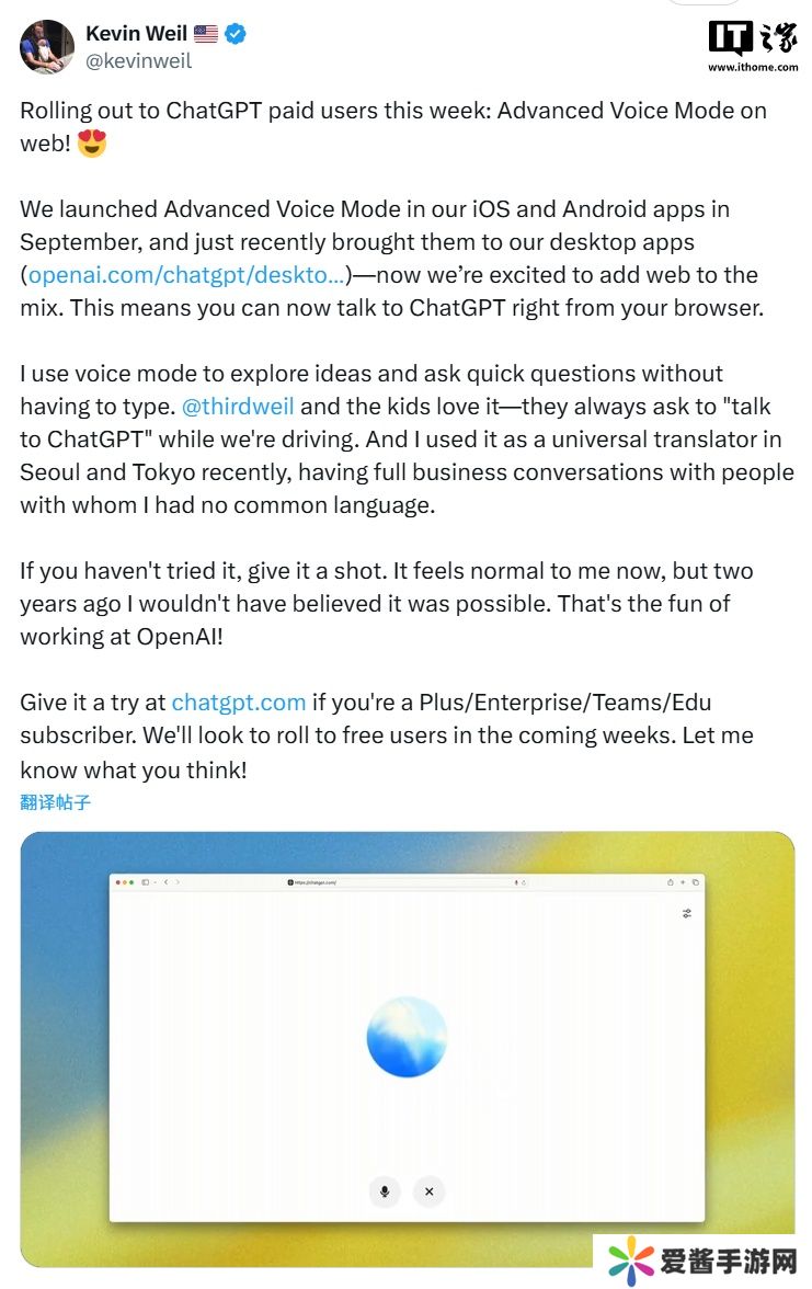 本站 11 月 22 日消息,北京时间本周三凌晨,OpenAI 首席产品官凯文・威尔(Kevin Weil)通过 X 平台确认,高级语音模式(Advanced Voice Mode)在本周全面上线 ChatGPT 网页版,面向付费用户开启。