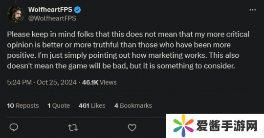 这其中包括 WolfheartFPS,他表示包括他自己在内的 3 名内容创作者没有拿到评测代码。随后他还补充指出,自己之前发布的包含更多批评的评测并不是导致自己没有获得测评代码的直接原因,并表示这只是正常的营销过程,并不意味着游戏质量会很糟糕。