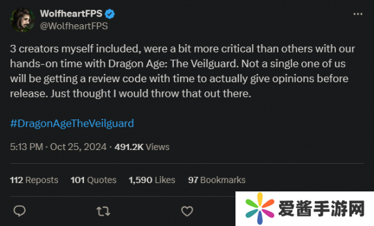 媒体 Fextralife 则更加直白。在最新发布的视频“关于《龙腾世纪:影障守护者》评测的真相”中,该媒体表示自己同样不会在首发前发布评测,因为自己同样没有获得评测码,即便此前同样为游戏给予了好评,并且当时的预览视频是油管上观看次数最多的视频之一。即便该视频下许多人甚至批评他们在“跪舔”生软,他们在预览后就再也没有收到 EA 和 BioWare 的联系。