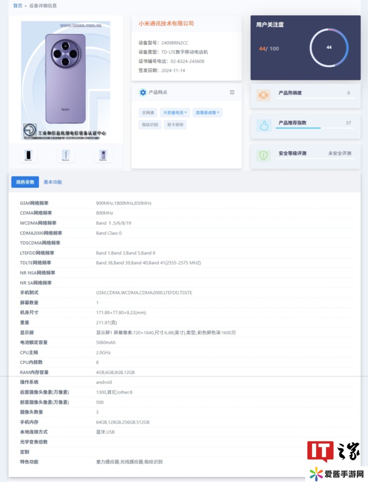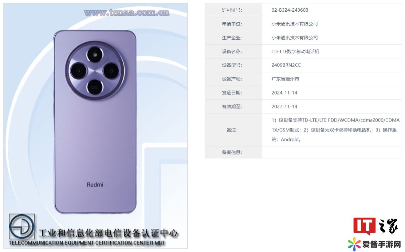 本站 11 月 24 日消息,型号为“2409BRN2CC”的小米 Redmi 新机已于 11 月 14 日获工信部电信设备进网许可,该设备支持双卡双待功能,“证件照”现已上线。