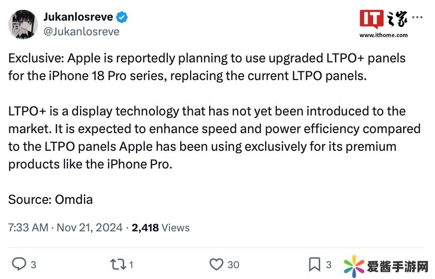 本站 11 月 23 日消息,消息源 Jukanlosreve透露,苹果公司已为 2026 年推出的 iPhone 18 Pro / Max 手机设定线路图,系列机型将引入全新 LTPO + 屏幕面板技术,以与标准版数字系列iPhone 18产生差异。