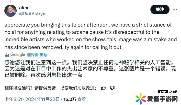 另一位用户随后在 X 平台上批评这张海报“令人失望且不尊重创作者”。对此,《英雄联盟:双城之战》的品牌负责人 Alex Shahmiri 表示:“感谢你的反馈。我们对《英雄联盟:双城之战》的内容始终坚持‘拒绝 AI’的严格立场,因为这一行为是对那些付出努力的艺术家们的不尊重。这张图片是一次失误,现已被撤下。再次感谢你的提醒。”