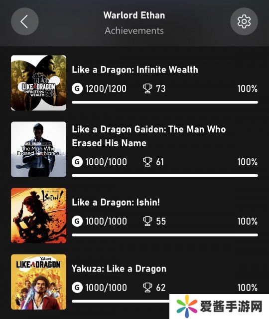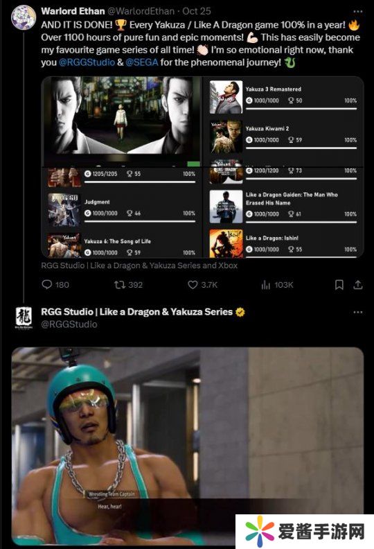 不过《如龙》系列的粉丝玩家可能更关注的还是游戏作品,例如最近完成了1年内全部100%通关系列游戏成就的玩家“Warlord Ethan”。