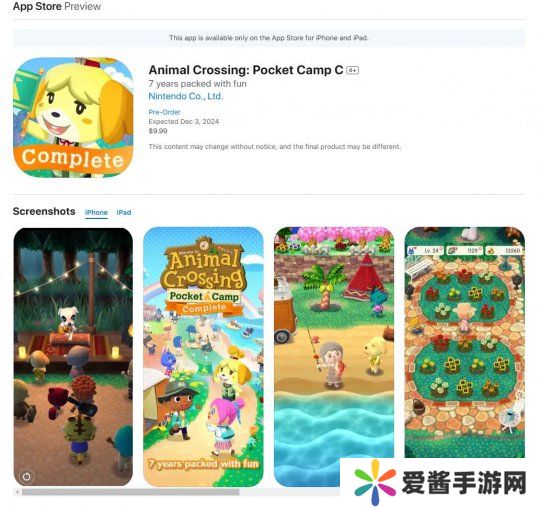 近日任天堂正式公布了买断制《动物森友会:口袋露营广场集合版》的上线时间,将于2024年12月3日登录iOS和安卓平台,目前已在双端的商城页面上线,并提供事前登录和预定,目前预定价格为9.99美元(iOS端,约合人民币71.3元)。