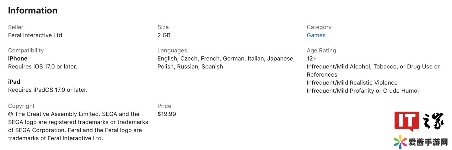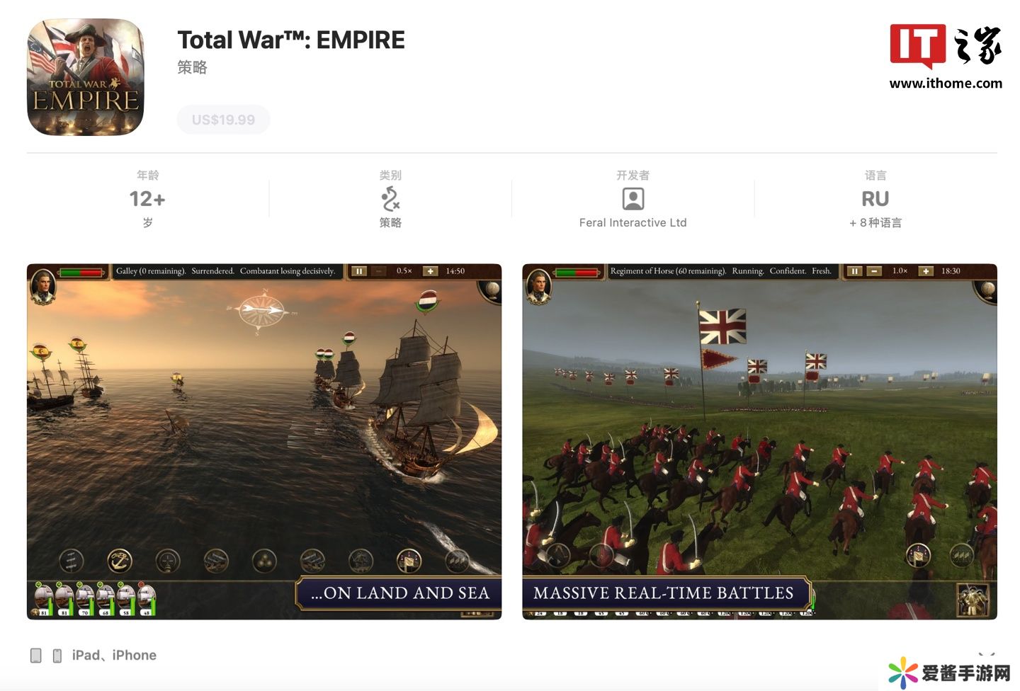 本站11 月 23 日消息,开发商 Feral Interactive 旗下经典策略游戏《帝国:全面战争》现已正式登陆 iOS 与安卓平台,本作 iOS 版仅支持iPhone/iPad,不兼容Mac,不支持中文,售价 19.99 美元(本站备注:当前约 145 元人民币),本站附苹果App Store美区地址如下(点此访问)。