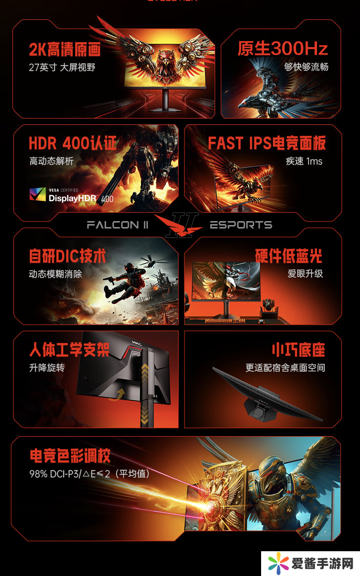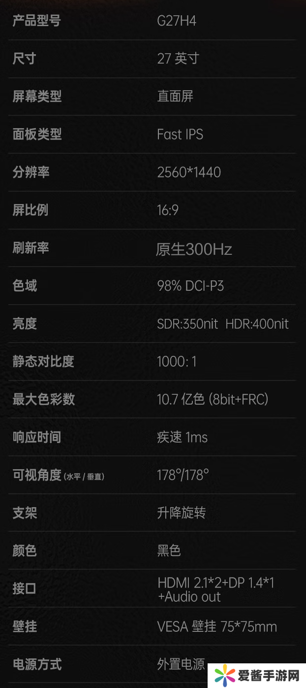 这款显示器配备2560x1440分辨率原生300Hz Fast IPS面板,亮度400尼特,静态对比度1000:1,响应速度1ms,支持10-Bit色彩(8-Bit + FRC),覆盖98% DCI-P3色域。