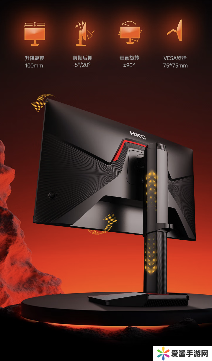 这款显示器支架支持升降 / 旋转,显示器本体支持VESA 75x75mm壁挂,提供2个HDMI 2.1接口、1个 DP 1.4接口、1个 3.5mm音频接口。