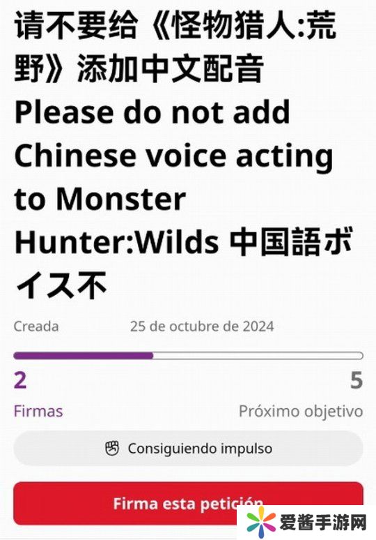 然而在该请愿网站上还有玩家发起另一个请愿,呼吁卡普空不要在《怪物猎人:荒野》里加入中文配音。