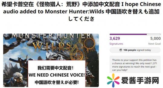 最近有玩家在请愿网站Change.org上发起请愿,呼吁卡普空在《怪物猎人:荒野》中加入中文配音。目前该请愿已获得3629人支持,下一个里程碑为5000人。