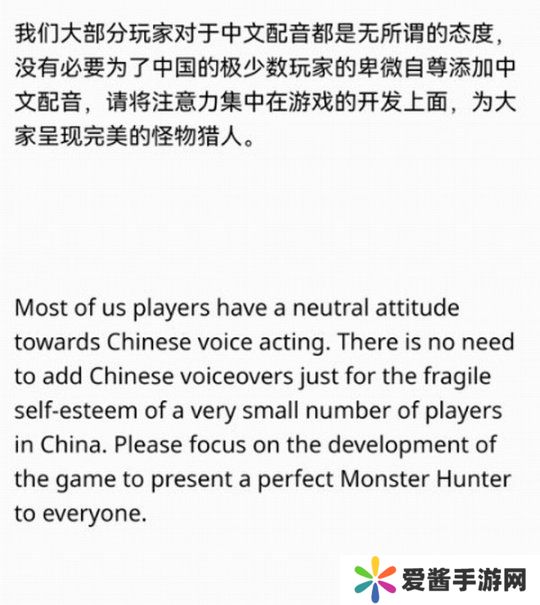 该请愿赫然写着:“我们大部分玩家对于中文配音都持无所谓的态度,没必要为了中国极少数玩家的卑微自尊,而添加中文配音”。这也迅速引起众怒,有人表示:“难道要求中配还有错了吗?”“你是不是对中国玩家有意见?”