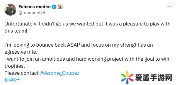 Falcons在未能晋级上海Major后下放了队内选手Maden、Snappi、dupreeh三人。近期,Maden发表了一篇文章用以求职,寻找一个“雄心勃勃”的队伍。