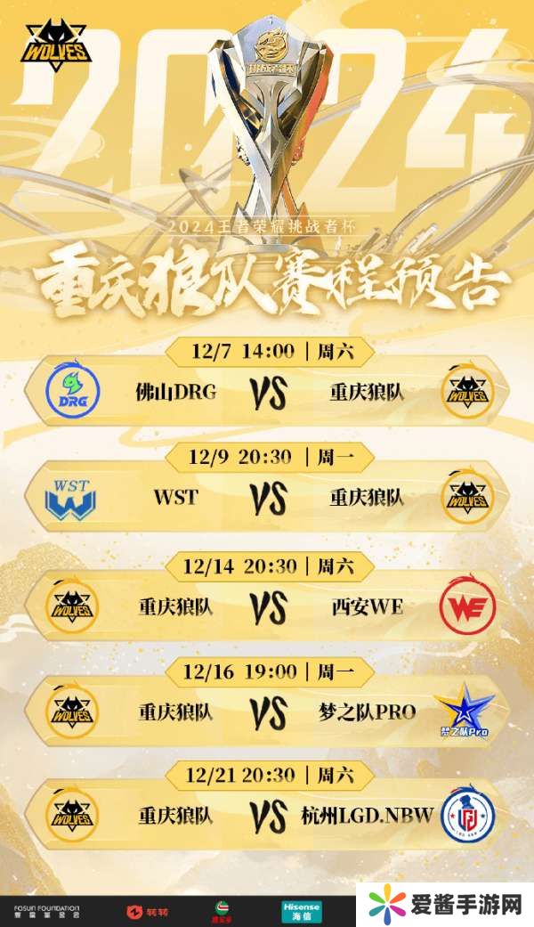 虎扑11月26日讯 狼队发布挑杯小组赛程:揭幕战对阵DRG,一半以上为黄金档!