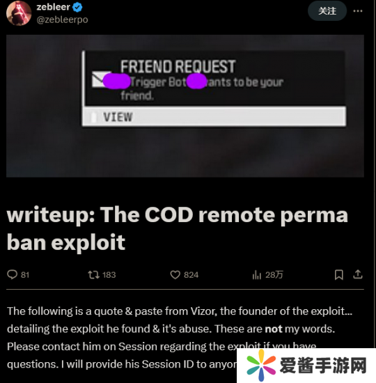 根据一份来自**制作者在社交媒体上发布的文章称,这个漏洞已经被发现了几个月之久,这段时间以来许多人一直在使用它封禁别的玩家,甚至针对性的攻击一些主播。让他人被封禁只需要和目标在同一个大厅里并在聊天中输入一些特定文字即可,例如“Trigger Bot“——也就是自动点击**,会在你的鼠标移动到可以击杀敌方玩家的地方时自动进行鼠标/手柄扳机输入。