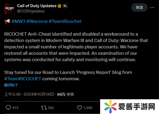 游戏的更新官方社交媒体写道:“RICOCHET 反作弊团队确认并禁用了一个在《现代战争3》以及《使命召唤:战区》中检测系统的临时权宜功能,该功能影响了少量正常玩家的账户。我们已经恢复了所有受影响的账户。”