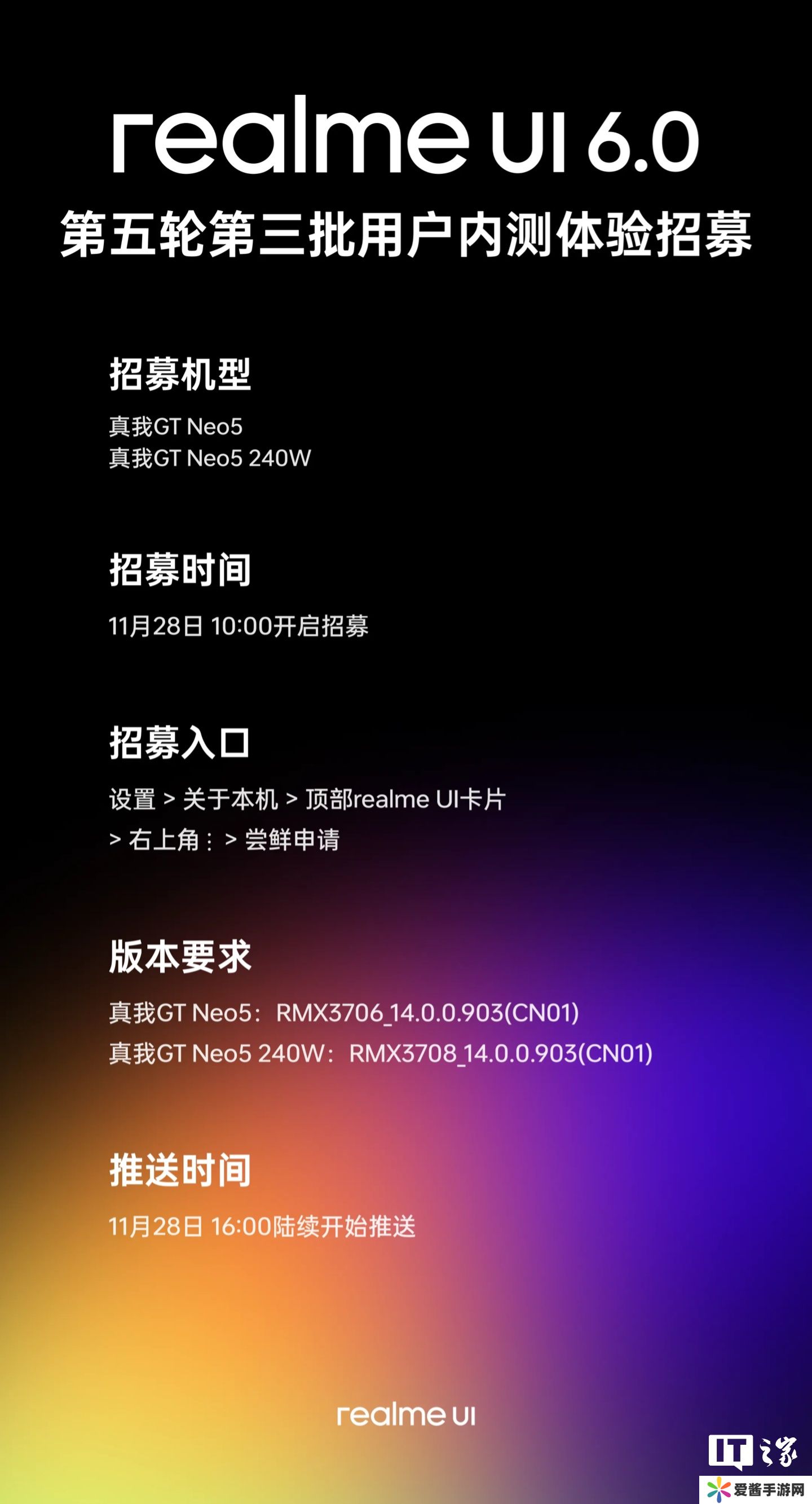 本站 11 月 28 日消息,realme UI 6.0 第五轮第三批内测用户招募今日开启,选定真我 GT Neo5、真我 GT Neo5240W 作为第五轮第三批招募机型。
