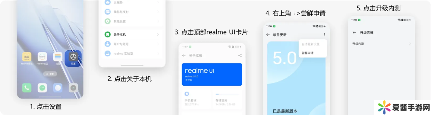 招募入口:设置 > 关于本机 > 顶部 realme UI 卡片 > 右上角 ⋮ > 尝鲜申请
