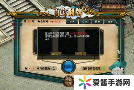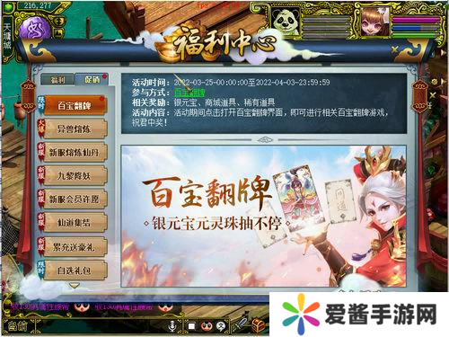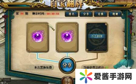 活动期间,可以在游戏界面右上角点击“福利”找到“百宝翻牌”按钮参与活动。通过将三张牌凑成同一图案,可以赢得元宝、道具、积分等奖励。通过同时置换三张牌,或者在两张牌已经相同的情况下,单独抽取第三张牌来完成整个图案。参与活动的首次置换完全免费,每15分钟还能获得一次免费置换三张牌的机会。