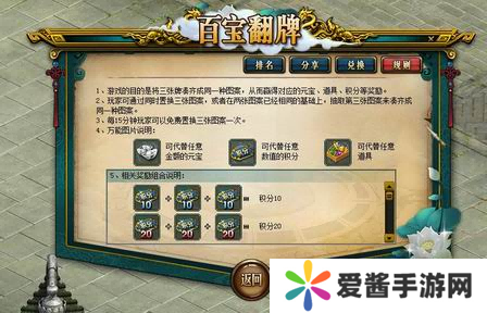 此外,玩家还可以在分享页面获取他人分享的两张相同图案。当玩家的翻牌状态处于A+A+B的状态下,就可以进行分享操作,分享后将额外获得积分奖励。每位玩家每日最多可分享20次,每日最多可获得200点积分,这些积分可用于兑换超级神兽丹、道具套餐卡、超级绿水晶等多种实用道具。在百宝翻牌环节中,还有概率翻出万能图片,它能够代替任何置换图片使用。
