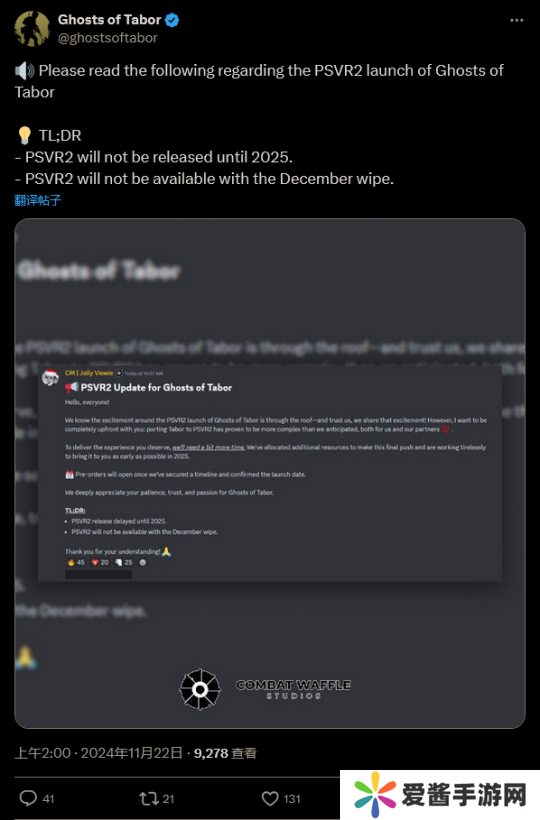 在社交媒体上的一篇帖子中,开发者对延期进行了解释,写道:“我们知道《塔博尔幽灵》在 PSVR2 上即将在发布令人兴奋不已 - 相信我们,我们也有同样的兴奋!然而,我想完全坦白地告诉大家:事实证明,对于我们和我们的合作伙伴来说,将《塔博尔》移植到 PSVR2 比我们预期的要复杂得多。”