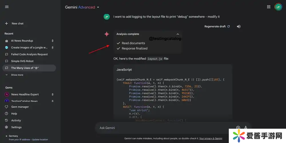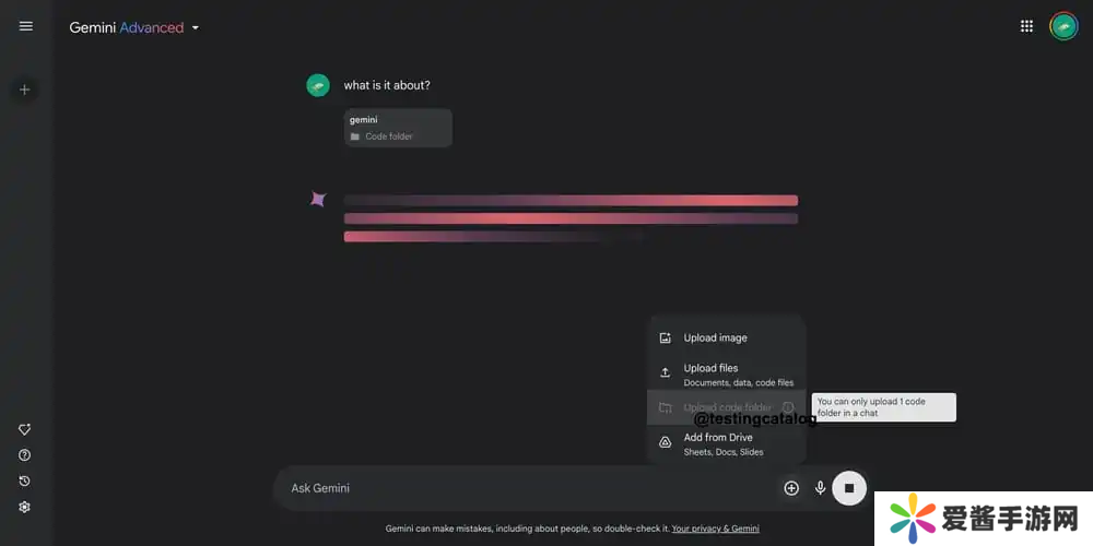 与此同时,“Testing Catalog”也在网页端的 Gemini 发现了一部分变化,详见下图。用户可以选择每个聊天中的一组文件夹,每组文件夹最多可包含 1000 个文件,且单个文件夹的总大小限制为 100MB。在上传了文件夹之后,用户便可以向 Gemini 询问关于代码库的问题。