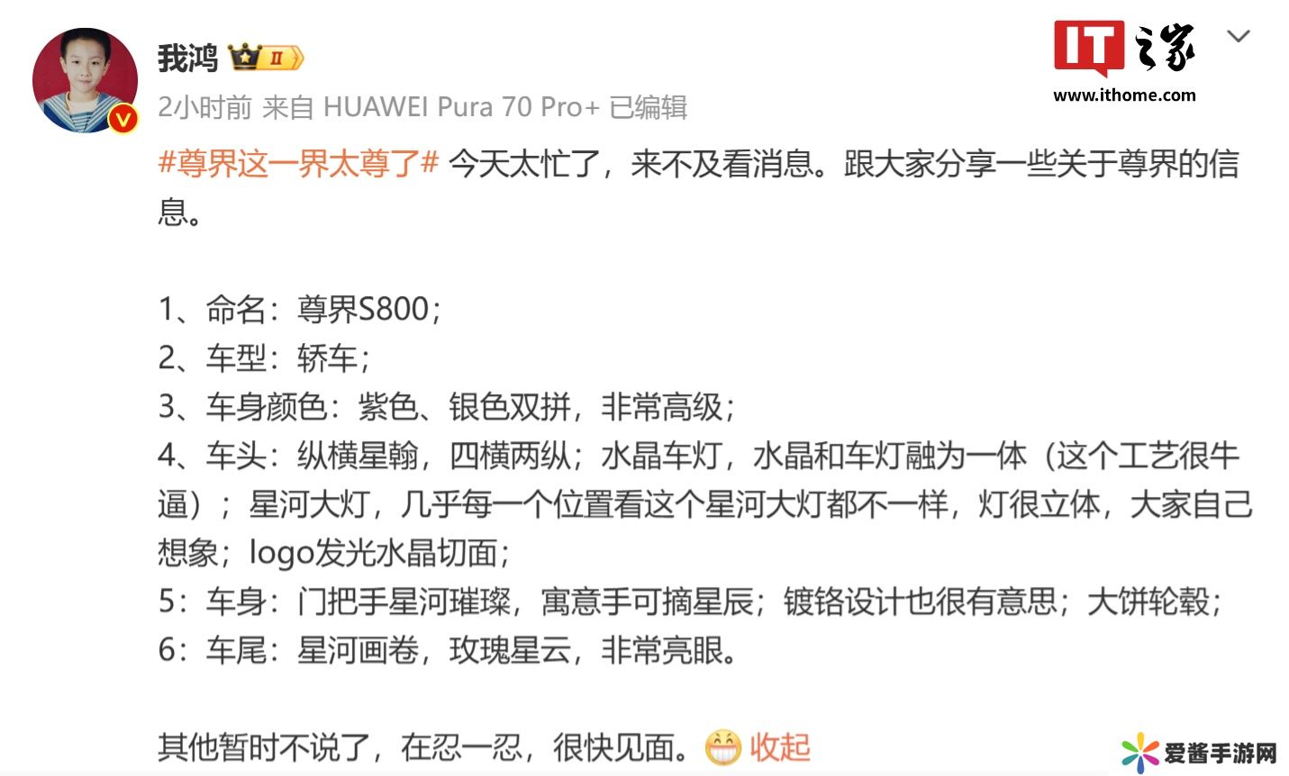 本站 11 月 15 日消息,博主 @我鸿 今晚透露,鸿蒙智行尊界轿车命名为“S800”: