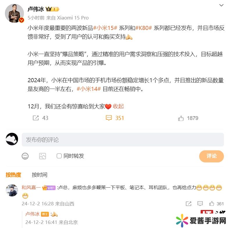 本站 12 月 2 日消息,小米集团合伙人、总裁,手机部总裁,小米品牌总经理卢伟冰今日发文称,小米 2024 年在中国市场的手机市场份额稳定增长 1 个多点,并表示“12 月,还会有惊喜给到大家”。