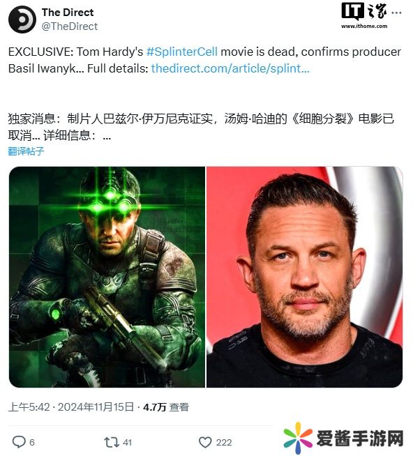 本站 11 月 16 日消息,育碧旗下汤姆・克兰西冠名的动作冒险游戏《细胞分裂》2012 年首次宣布将改编为同名电影,但 12 年之后仍处在“待产”阶段。