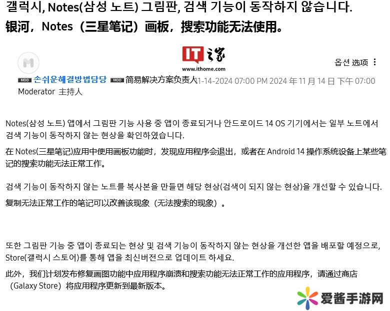 本站 11 月 16 日消息,科技媒体 sammyguru 昨日(11 月 15 日)发布博文,报道称三星官方已承认笔记应用 Samsung Note 存在 BUG,导致搜索、绘图等功能出现故障。
