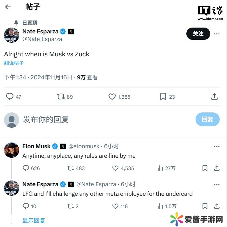 在赛事结束后,有网友问马斯克 VS 扎克伯格的“笼斗”何时能够上演,马斯克回应称:“任何时间、任何地点、任何规则,我都随时奉陪。”该网友还表示:“都给我冲!另外,我愿意作为垫场赛挑战任何 Meta 员工。”