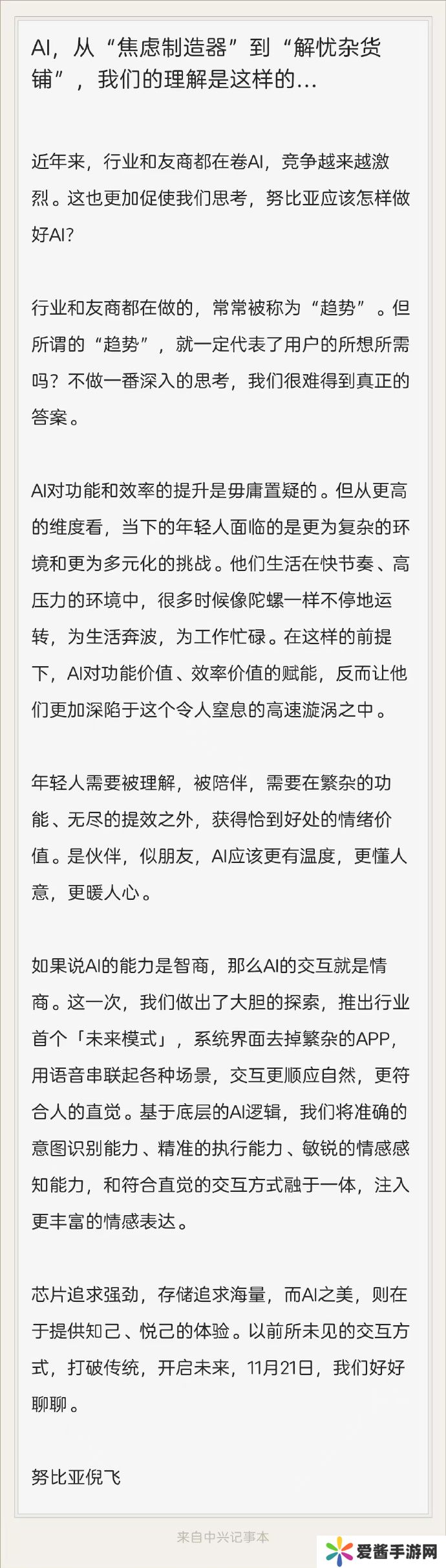 本站 11 月 16 日消息,今天下午,中兴通讯终端事业部总裁、努比亚技术有限公司总裁倪飞发布长文,提到了自己对 AI 的看法。