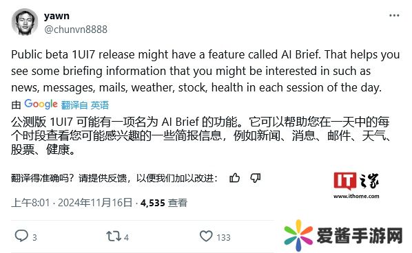 本站 11 月 16 日消息,消息源 @chunvn8888 今天(11 月 16 日)在 X 平台发布推文,曝料称三星 One UI 7.0 更新将引入 AI Brief,定时播报用户感兴趣的内容。