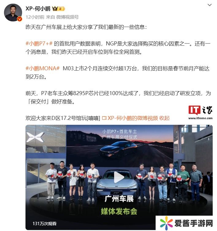 此外,小鹏 P7+ 汽车行业首个一套软件实现「车位到车位」已于 11 月 15 日开启全网首测。小鹏P7 车型智能座舱芯片众筹已于 11 月 14 日达成,研发工作也已启动。
