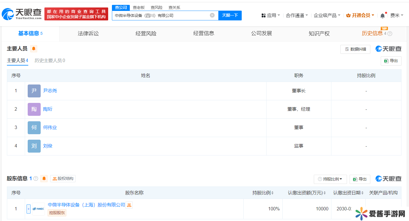 天眼查App显示,近日,中微半导体设备(四川)有限公司成立,法定代表人为尹志尧,注册资本1亿人民币,经营范围含半导体器件专用设备制造、半导体器件专用设备销售、电子专用设备销售、电子专用设备制造、半导体照明器件制造、电子元器件制造等,由中微公司(688012)全资持股。