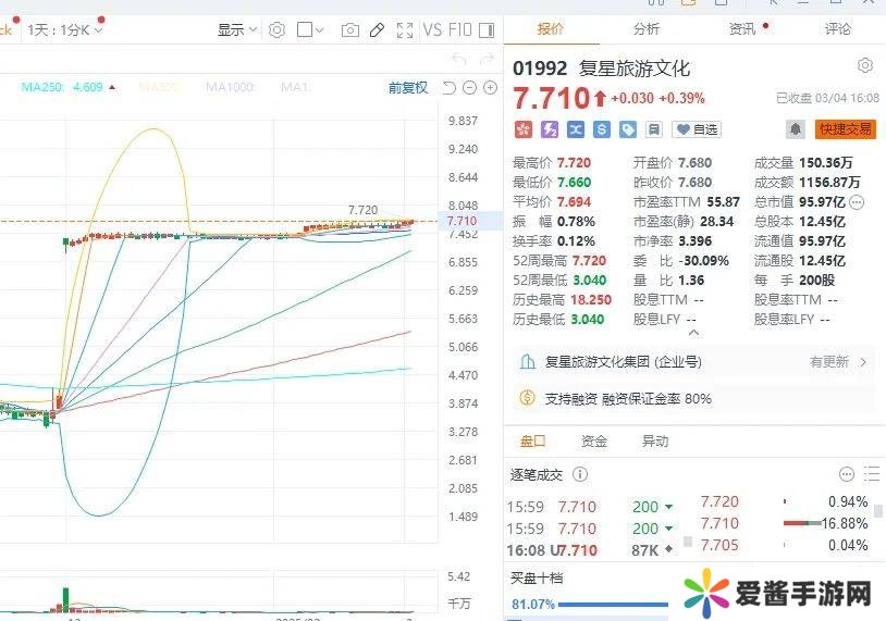 复星旅游文化去年12月11日开盘大涨83%,收涨80.25%,报7.21港元/股,最新市值89.71亿元。