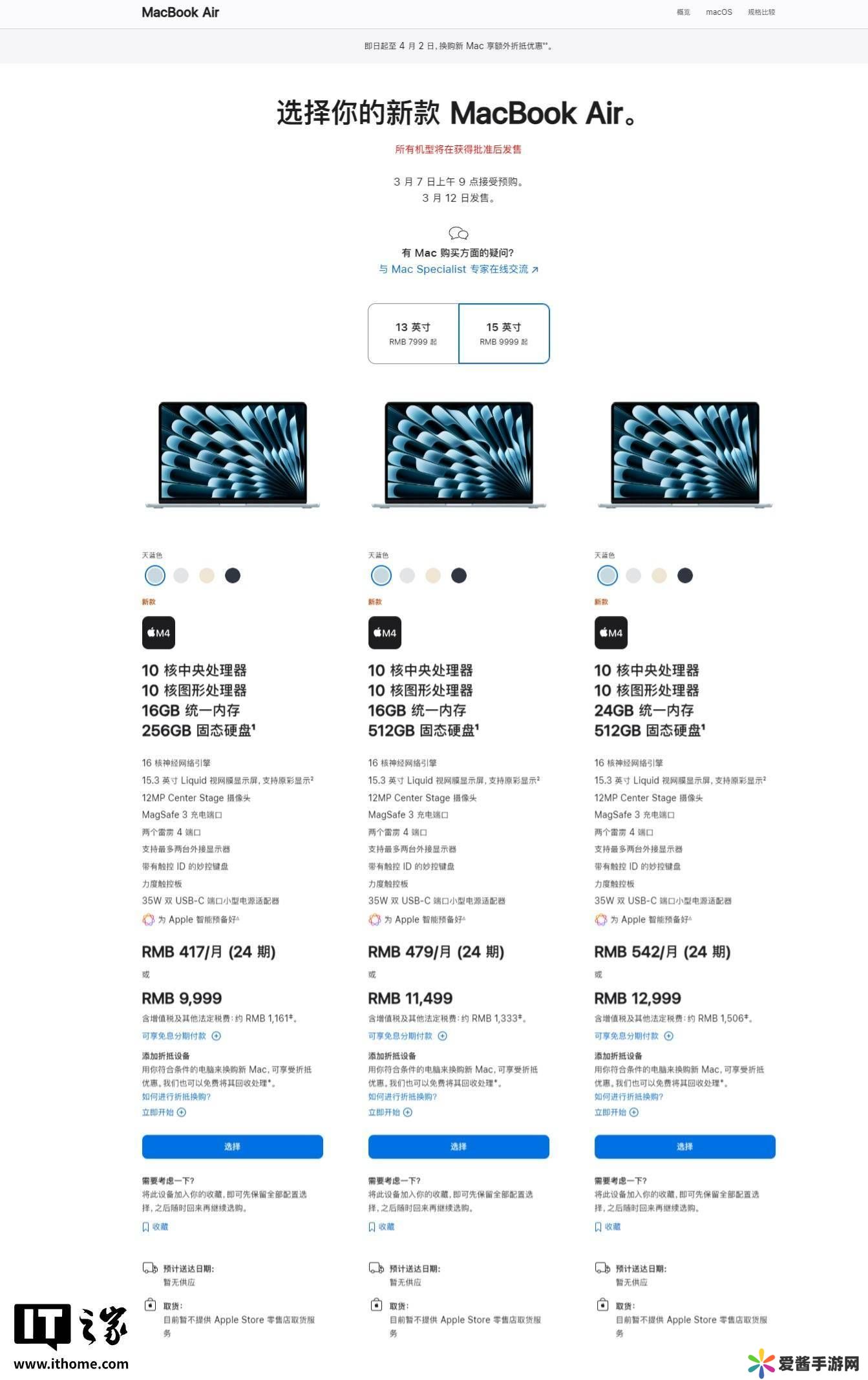 新款 MacBook Air 将于 3 月 7 日上午 9 点接受预购买,3 月 12 日发售。搭载 M4 芯片的 13 英寸 MacBook Air 起售价为 7,999 元,教育优惠起售价为 7,249 元;搭载 M4 芯片的 15 英寸 MacBook Air 起售价为 9,999 元,教育优惠起售价为 9,249 元 。两款机型均提供天蓝色、午夜色、星光色和银色外观可选。