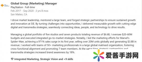 Kevin Kimbal还在索尼工作时,曾领导过一个大型团队,并参与了2018年《漫威蜘蛛侠》的营销工作,他在领英页面中写道:“我领导了《漫威蜘蛛侠》的营销工作,使其在第一年就实现了971%的销量增长,全球销量超过2000万,创造了38亿美元的收入。”