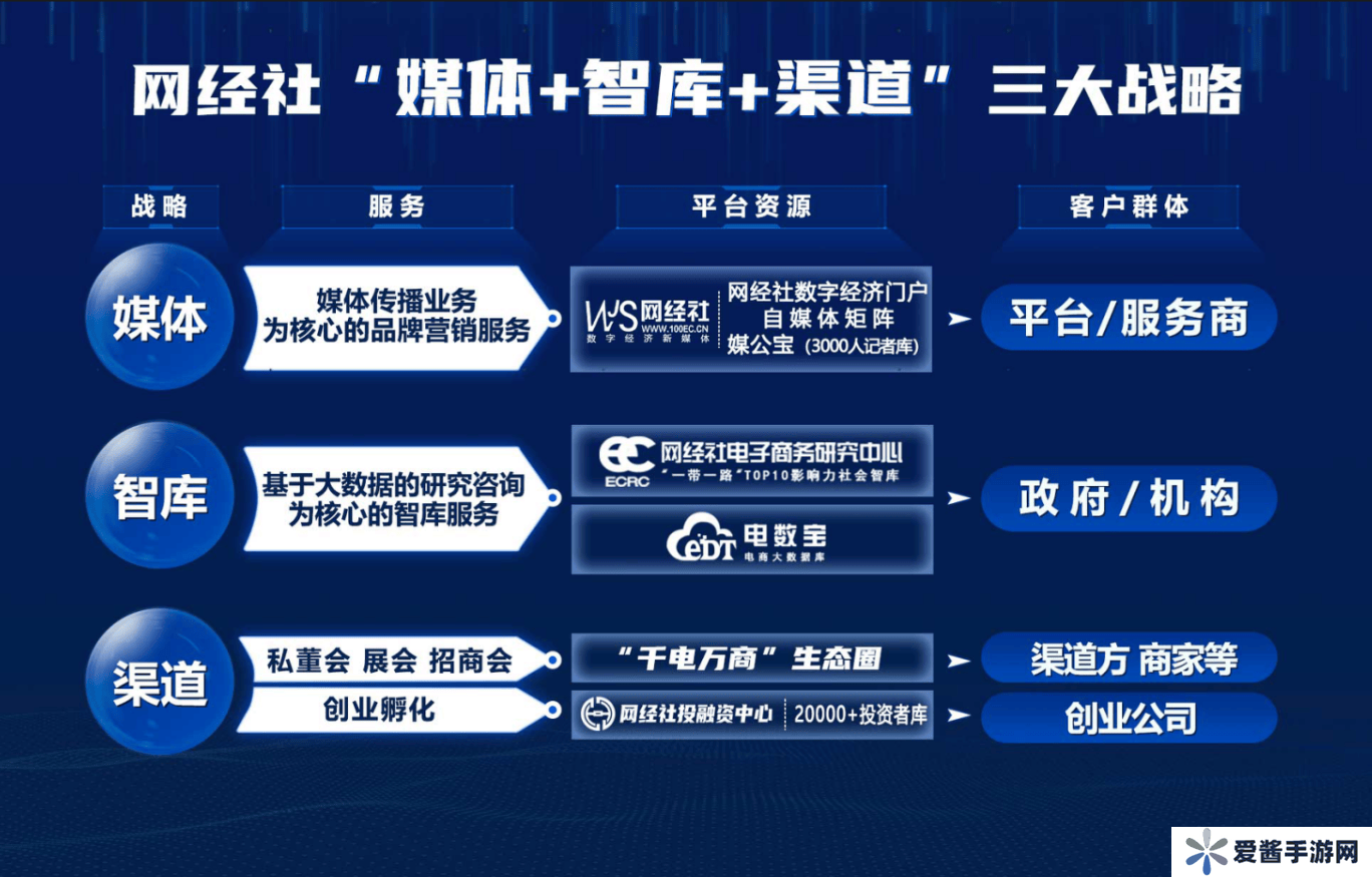 基于媒体平台、专业智库以及渠道三大战略,提供“媒体+智库”、“会员+孵化”服务;(1)面向电商平台、头部服务商等PR条线提供媒体传播服务;(2)面向各类企事业单位、**部门、培训机构、电商平台等提供智库服务;(3)面向各类电商渠道方、品牌方、商家、供应链公司等提供“千电万商”生态圈服务;(4)面向各类初创公司提供创业孵化器服务。
