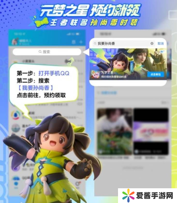 2、玩家在QQ内搜索“我要孙尚香”即可前往游戏预约页面,完成游戏预约之后即可获得“王者联名孙尚香时装”,在公测后使用预约账号登录游戏即可免费领取。